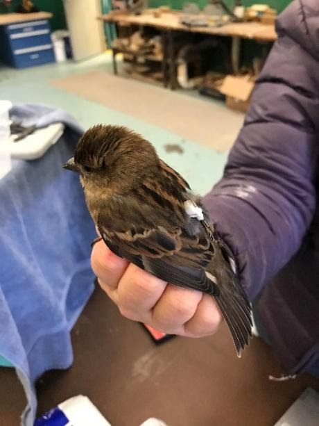 Last month, the Purple Martin team attended a workshop led by Andrea Patterson, Master Bander, NABC Trainer, Board President of the Braddock Bay Bird Observatory. Andrea is a masterful instructor and came prepared to share with project leader Dr. Williams and the team her expertise in attaching Motus tags to conduct long range tracking of migratory birds. Andrea arrived with a cage containing several House Sparrows, which she captured with a mist net at an apartment complex near her home. (All the sparrows were returned alive to that location!) Those of us with various levels of banding training had the opportunity to practice putting tiny backpacks with tag transmitters on the House Sparrows. Speaking for myself, the hardest part was making sure the straps fit over the bird’s thigh. So many feathers in the way of seeing what was what! Confidence came with practice.